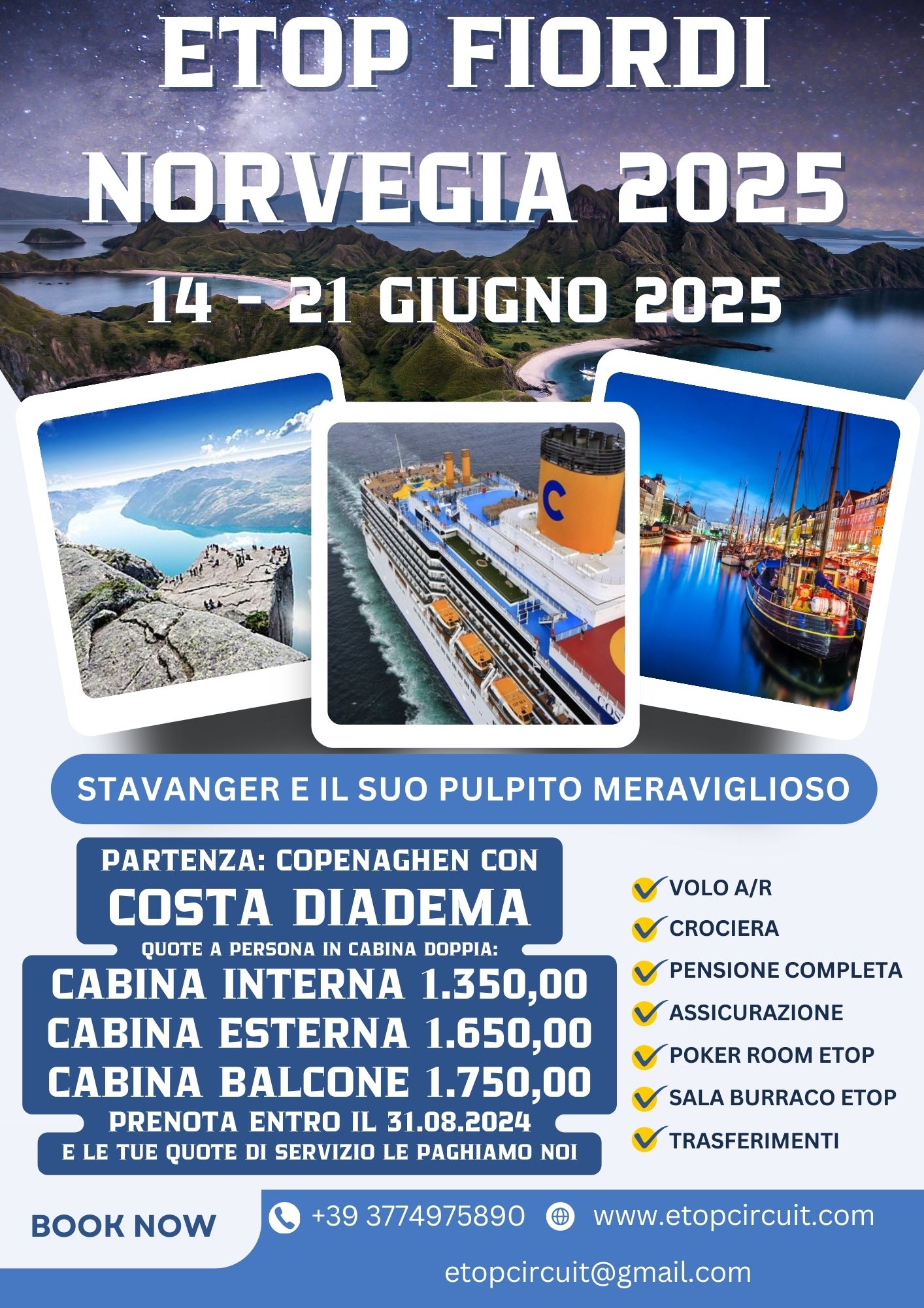 ETOP Norvagia, andiamo alla scoperta dei fiordi norvegesi e dei panorami mozzafiato. Pensiamo a tutto noi, dovrai solamente preoccuparti di divertirti. Nella locandina affianco troverai tutte le informazioni necessarie. Contattaci subito per prenotare questa avventura.