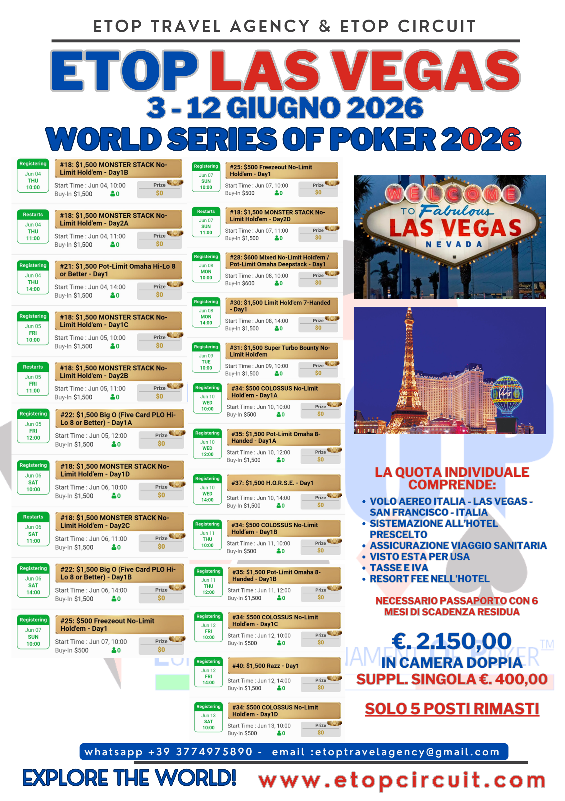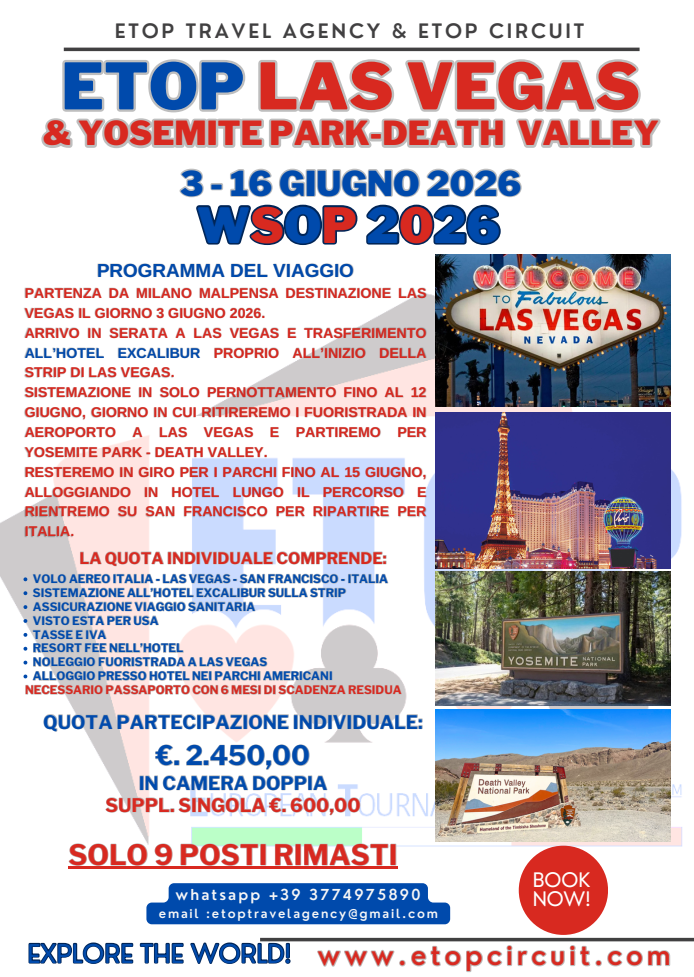 Un percorso che unisce la scintillante energia della Strip al silenzio surreale dei grandi parchi americani. L’esperienza ETOP Las Vegas & Yosemite – Death Valley è un viaggio completo: giorni immersi nella magia di Las Vegas, seguiti da un’avventura on-the-road tra vallate maestose, strade infinite e paesaggi che sembrano usciti da un film. Un itinerario pensato per chi vuole vivere l’America in tutta la sua magnificenza, dal neon dei casinò alla natura più selvaggia.