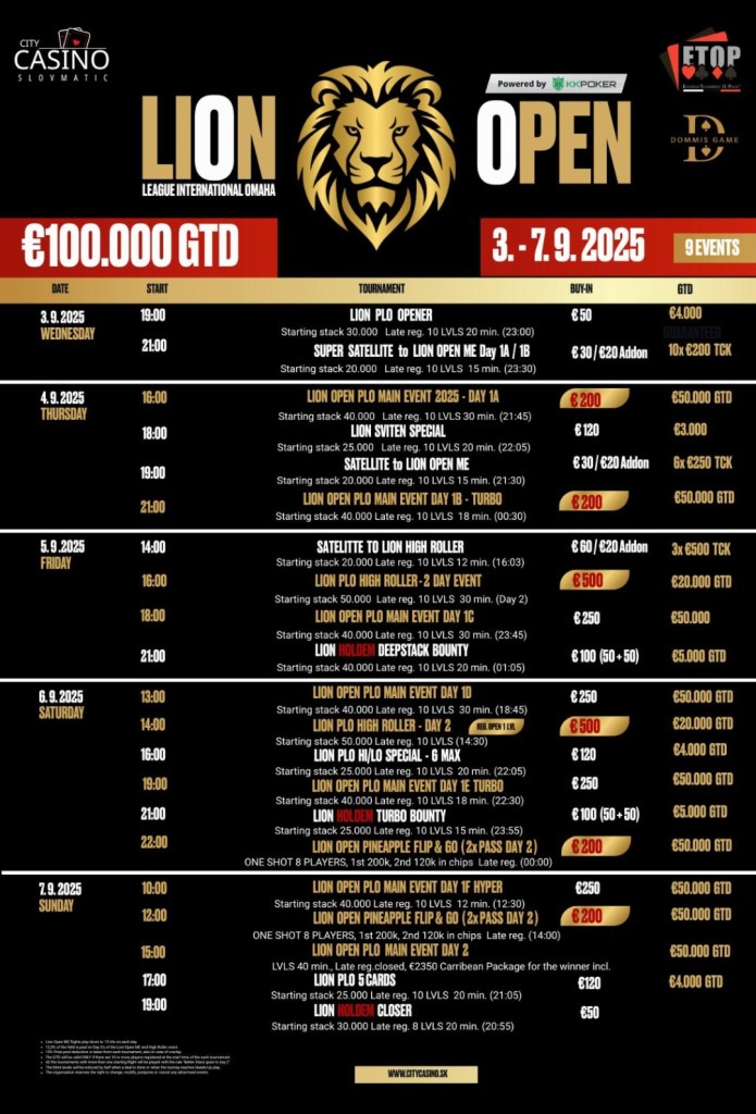 Il prestigioso City Casinò Nitra ospita uno degli eventi di poker più attesi dell’anno: il LION OPEN 2025, una serie esclusiva di tornei dedicati agli appassionati di Omaha e Hold’em.