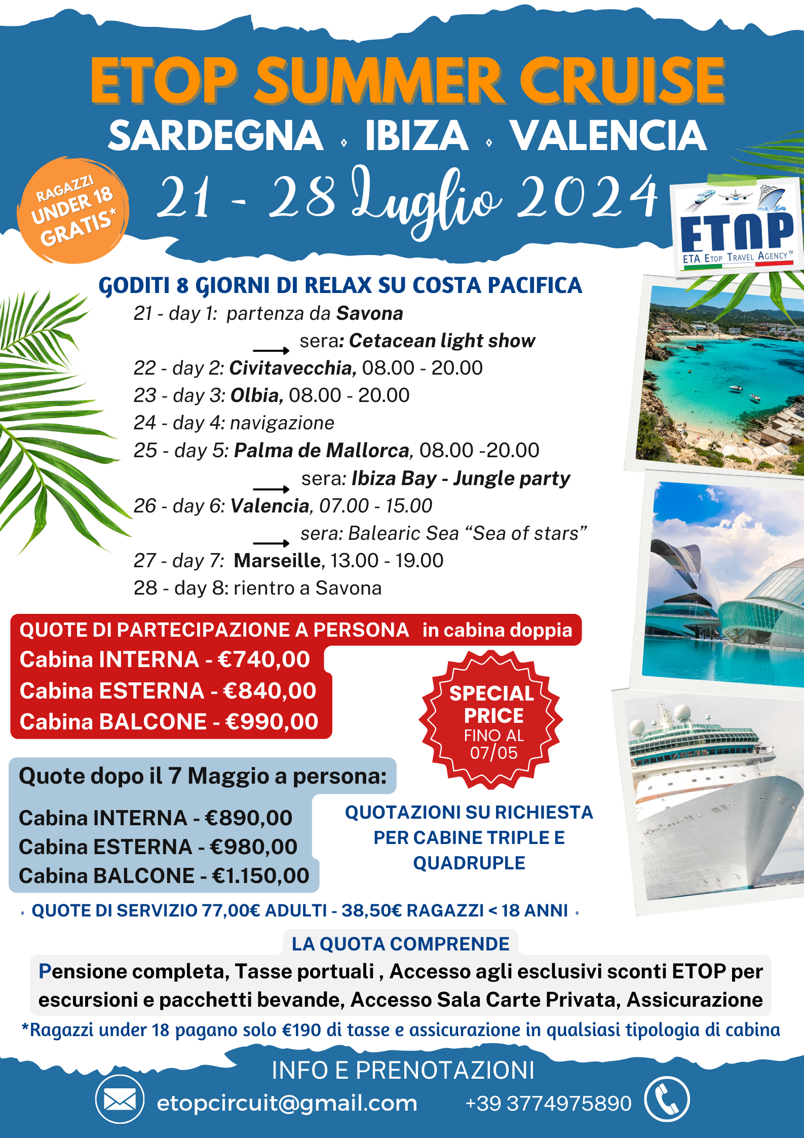 Ecco la locandina della nostra crociera di fine luglio, occasione unica soprattutto per le famiglie di fare una super settimana in un periodo di alta stagione, su una nave 5 stelle in pensione completa, godendo di tutti i servizi di Costa Crociere.