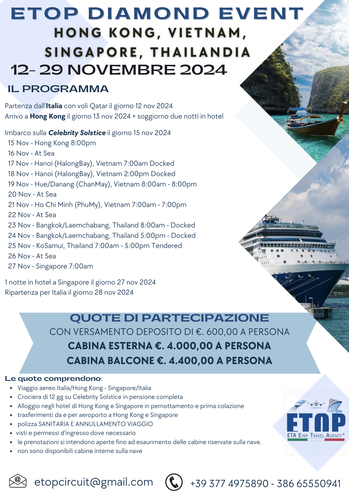ETOP Diamond Event – Un viaggio imperdibile organizzato da ETOP, che vi accompagna in ben quattro paesi: Cina, Vietnam, Singapore e Thailandia, dal 12 al 29 novembre. Le quote includono anche una crociera di dodici giorni in pensione completa, alloggio negli hotel di Hong Kong e Singapore e molto altro ancora!